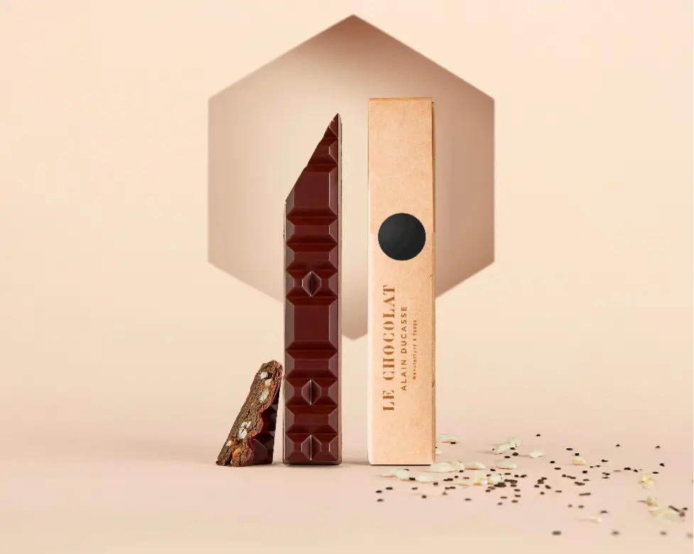 象徴的な幾何学デザインのショコラバーの中には、黒ごまとアーモンドのプラリネ、サクサクとした食感を添えるパフライスを閉じ込め、すべてをショコラノワールで包みました。